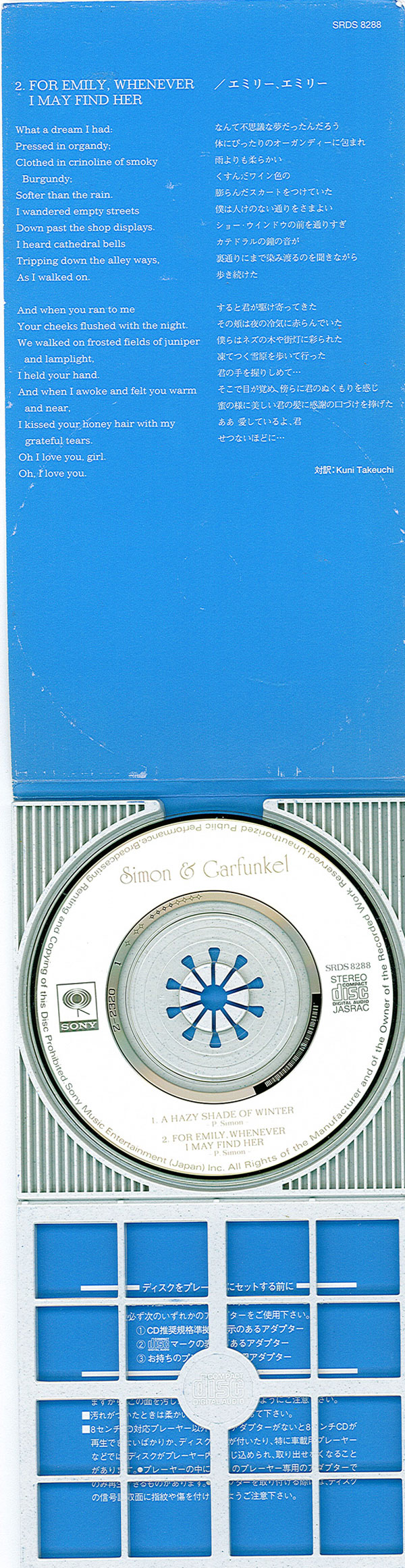 | Description: | Japanese only 2-track 3" CD single, also includes For Emily, Whenever I May Find Her, blue titled, brown tinted, snap-pack picture sleeve with lyrics to both tracks |